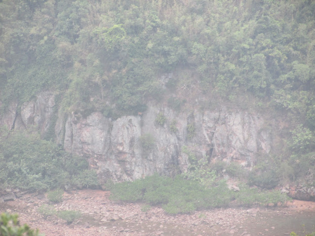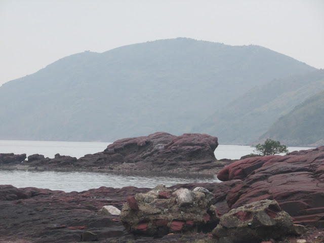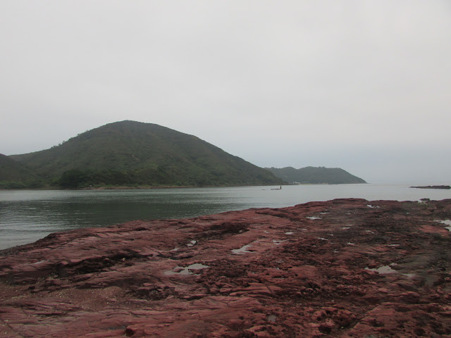 是日天色較為陰暗,加上到達花籃坑時已過四點,叢林裡不時傳來赤麂叫聲,而且數量不只一頭,相信再晚一點其他野生動物(如野豬)也會陸續出沒。再經一段密林往紅石門村。在紅石門村先休息二十分鐘,當然要把紅紅的石頭「帶回家」,原來在陰天下仍能攝出艷紅色的石頭,如是晴天景觀定必完美--因正好是日落時份,在十分偏僻的地方欣賞到日落確是個難得及刺激的經歷。五點鐘,就啟程快步上登至船灣淡水湖郊遊徑。