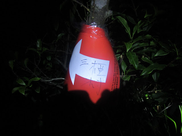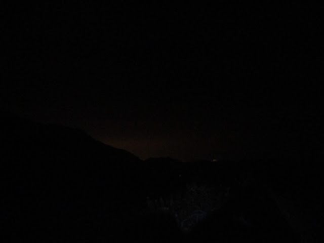 到達船灣淡水湖郊遊徑時天色已見昏暗,到大峒時更已全黑,可見三椏村路燈在亮起,而燈光最多的地方就是深圳鹽田港,因燈光反射至天空雲層的關係,使北面的天空出現一層橙色的輝光。最後就摸黑經苗田快速的回到烏蛟騰,抵達烏蛟騰時是七點十分,所以讓同伴先乘七點十五分的小巴離開,而坳仔不趕時間,加上要上廁所,所以就乘末班小巴回市區。