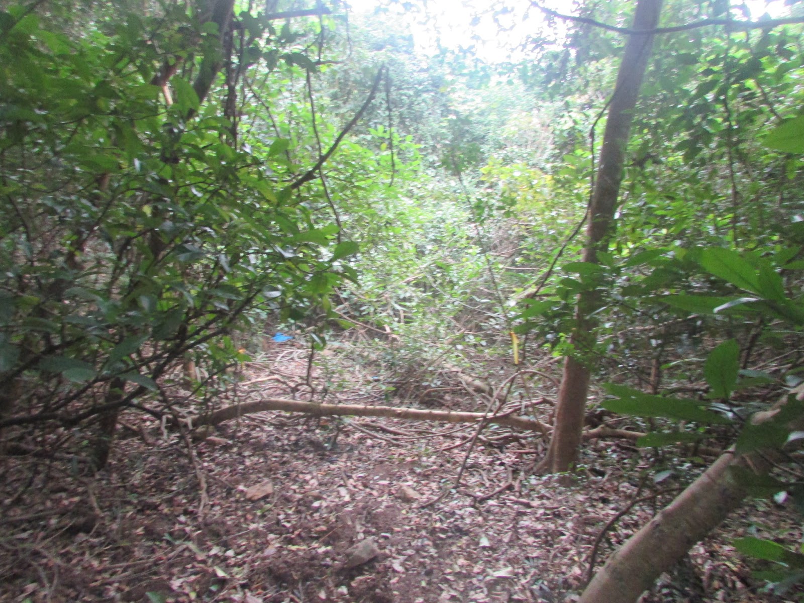 在小滘坳轉入「跌死狗」南面山腰路過鳳凰笏頂,然後在鳳凰笏頂一帶(東經114度18分23秒至33秒)覓路經山脊下鳳凰笏。不過,找著找著仍沒看到明顯的下山路口,只下了幾步就被樹枝重重遮蓋,但翻看過往遊記、相片,加上地政總署的航拍圖,相信幾年前有人到訪過之餘路況還是明顯,為何幾年間山徑入口會那麼快消失呢?在全球暖化的大趨勢下,植物生長似乎越來越旺盛,其他較少人走訪的山徑,幾年後很可能要消失了。