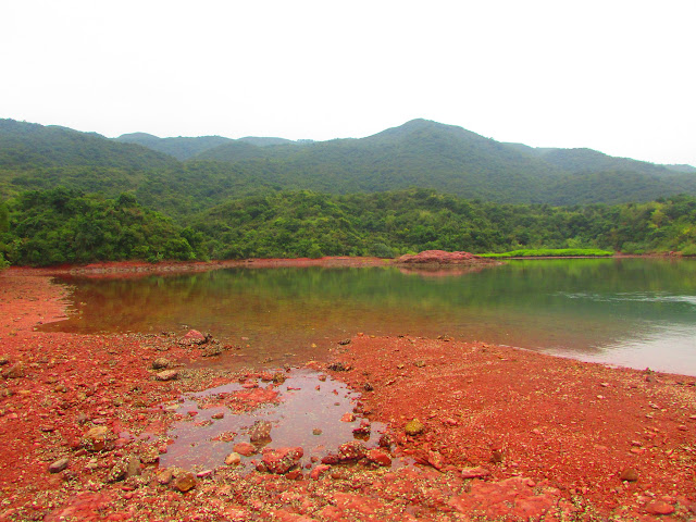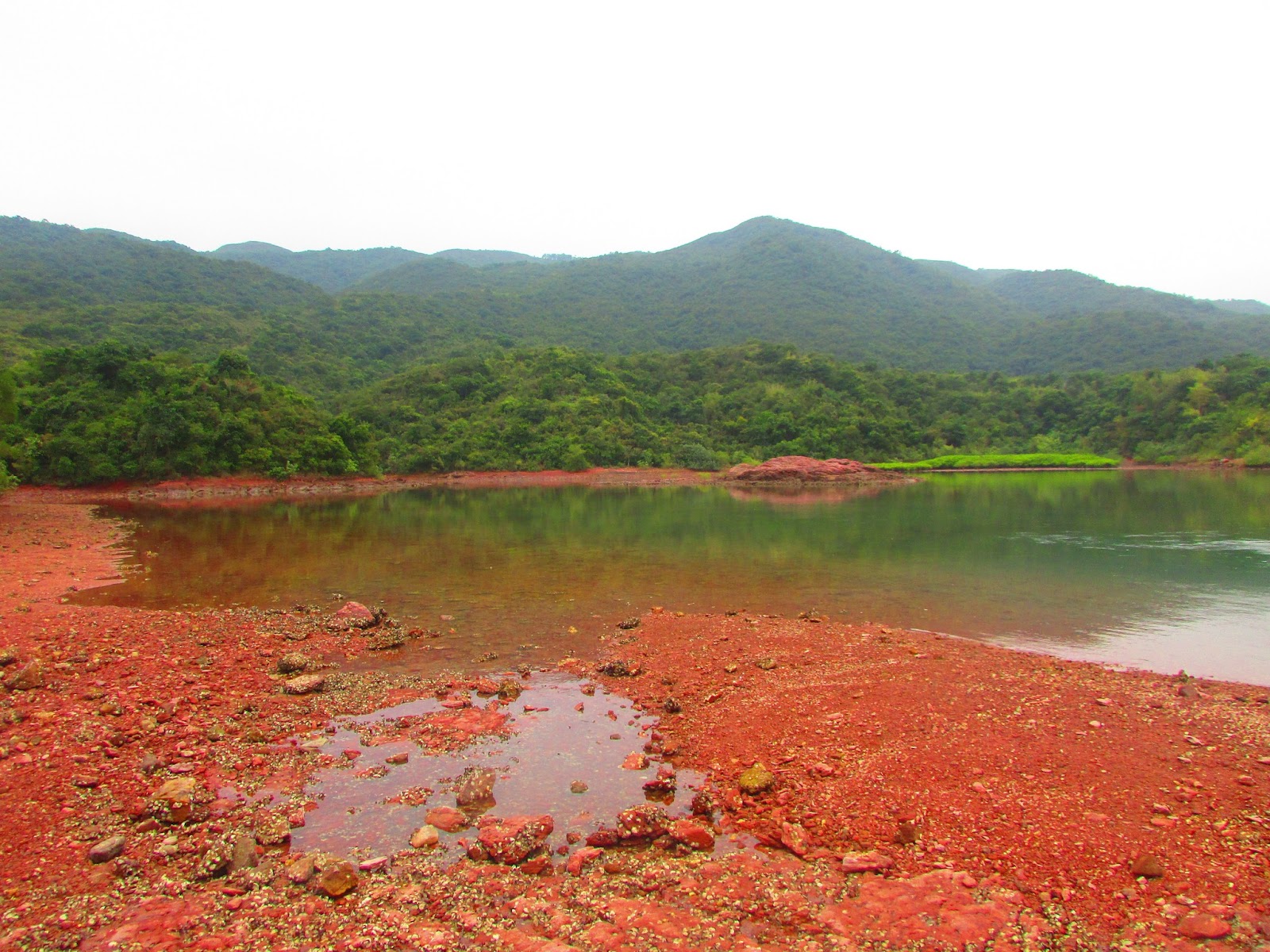 是日天色較為陰暗,加上到達花籃坑時已過四點,叢林裡不時傳來赤麂叫聲,而且數量不只一頭,相信再晚一點其他野生動物(如野豬)也會陸續出沒。再經一段密林往紅石門村。在紅石門村先休息二十分鐘,當然要把紅紅的石頭「帶回家」,原來在陰天下仍能攝出艷紅色的石頭,如是晴天景觀定必完美--因正好是日落時份,在十分偏僻的地方欣賞到日落確是個難得及刺激的經歷。五點鐘,就啟程快步上登至船灣淡水湖郊遊徑。