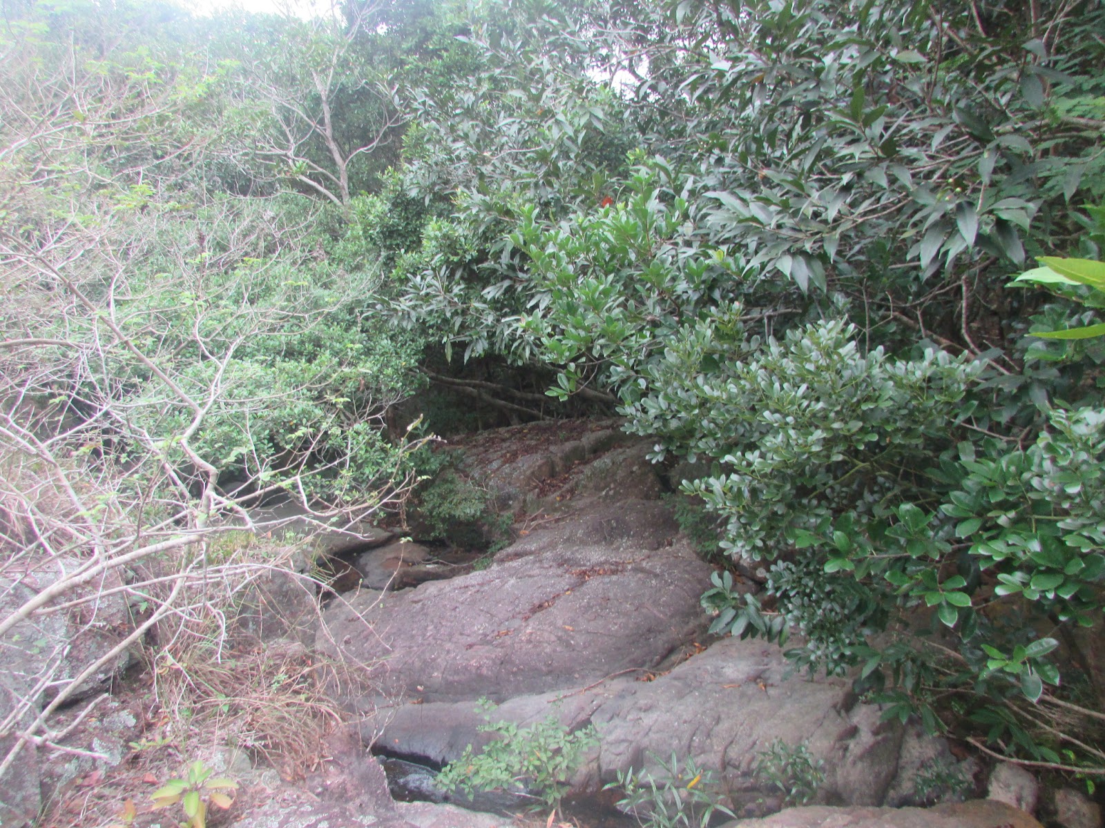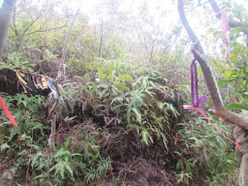 在小滘坳轉入「跌死狗」南面山腰路過鳳凰笏頂,然後在鳳凰笏頂一帶(東經114度18分23秒至33秒)覓路經山脊下鳳凰笏。不過,找著找著仍沒看到明顯的下山路口,只下了幾步就被樹枝重重遮蓋,但翻看過往遊記、相片,加上地政總署的航拍圖,相信幾年前有人到訪過之餘路況還是明顯,為何幾年間山徑入口會那麼快消失呢?在全球暖化的大趨勢下,植物生長似乎越來越旺盛,其他較少人走訪的山徑,幾年後很可能要消失了。