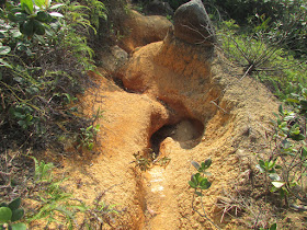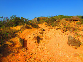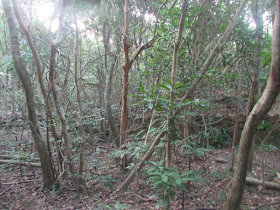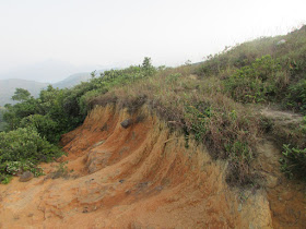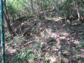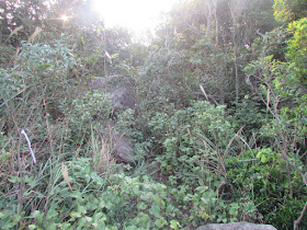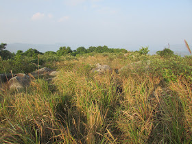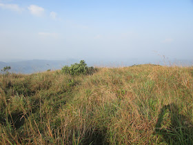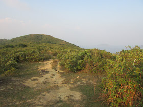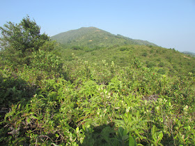 十分鐘後重新上路,山頂位置的小徑若隱若現,感覺就像草原上闖蕩般,那裡亦有個小路口下荔枝莊小塘營附近。再下一段,路況變成稀疏的灌木林為主。前方半百米處,忽然有頭小野豬從草叢間冒出,但很快從視野中消失,而且也沒傳來聲音。原來那頭野豬只隱藏在樹旁,因為再下走一小段,耳畔幾米處就傳來一趕嚎叫,其後就迅速跑進樹叢內。近一個月經常遇到野豬,十月中至今共十二天遠足日內,就已經遇上最少六次,相信是天氣開始轉涼,牠們要提早出動覓食。