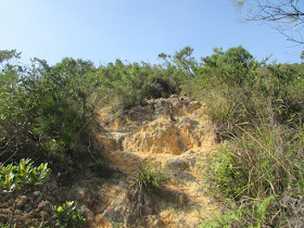 在水泥徑的最高點一帶,尋找左方的一道不明顯路口上擔柴山。初段是密林地帶,然後山徑稍為開揚,可是那個開揚地帶卻只是曇花一現,因為很快就轉入極密林地帶,路胚雖然明顯可見,但腿部高度處卻有厚厚的芒萁叢,只能「龜速」前進。穿了半小時的極密林地帶,上山後段就是較多風化的路,在廿六七度及陽光曝曬下,體力明顯下降,途中還被小石絆倒,幸無大礙。擔柴山一帶的路況,上地政總署的航拍圖與實際的路況似乎有很大出入。三點四十五分,抵達擔柴山頂,第一件事就是坐下來小休一會。