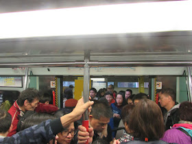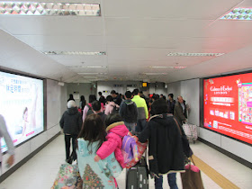 五點半就出門乘地鐵,較首班車時間還要早一點(前一晚地鐵有提供通宵服務)。六點半在九龍塘轉東鐵,已有不少人候車,隨著越近邊界,車廂也越見擠迫,到大埔墟時已呈「沙甸魚」狀態,到粉嶺站時車門也差點關不上,到上水站時站台已見不短的候車人龍,很多乘客明知車廂裡已不勝負荷,但「死都要迫上車」,因為大家都很趕時間,上不了那班車的又要多等十分鐘,很可能會錯過集合時間。有部分人在上水站下車(轉往羅湖方向?),不過被上車人潮弄至難以下車,不少乘客被壓至面容扭曲,有的更繼而尖叫、爭執,相當有「打仗」的感覺,此情景較紅、藍線轉車站下班時間的站台還要恐佈,幸好坳仔站在車門的另一側。回想起中秋長周末的潮汕之旅,七點半上水往落馬洲的列車還未爆滿,但現在才是七點十五分,可見長假期首天外遊人數明顯為多,因為上次的出發日只是普通的周六,有不少人還要上班的。
