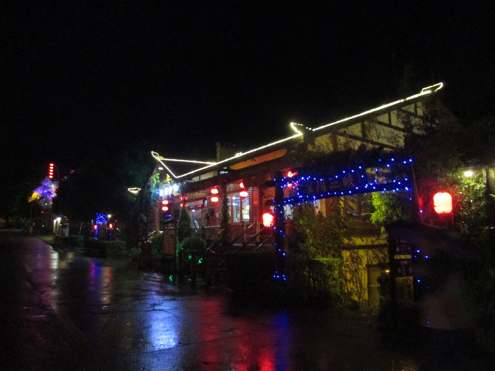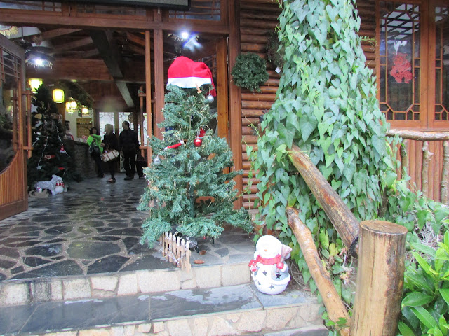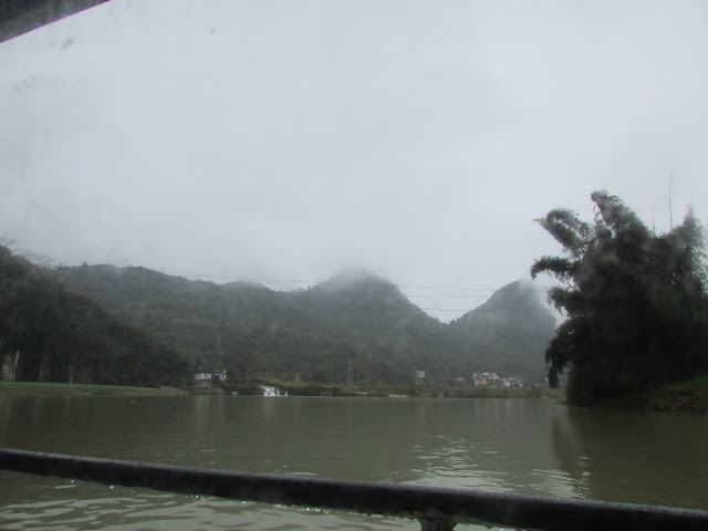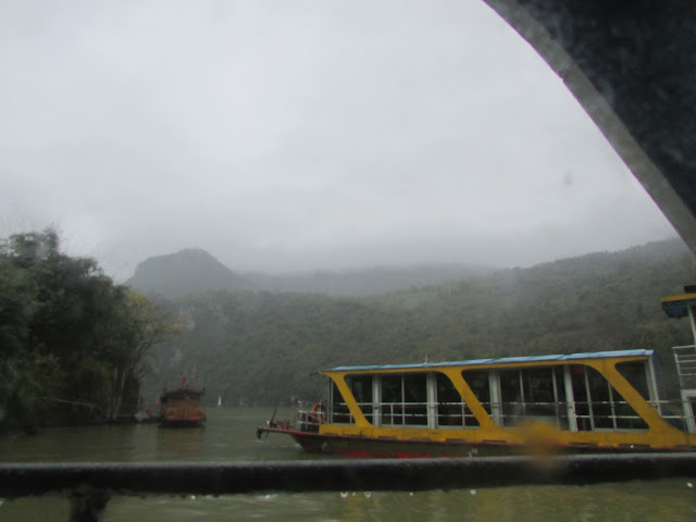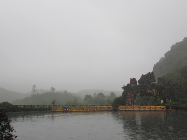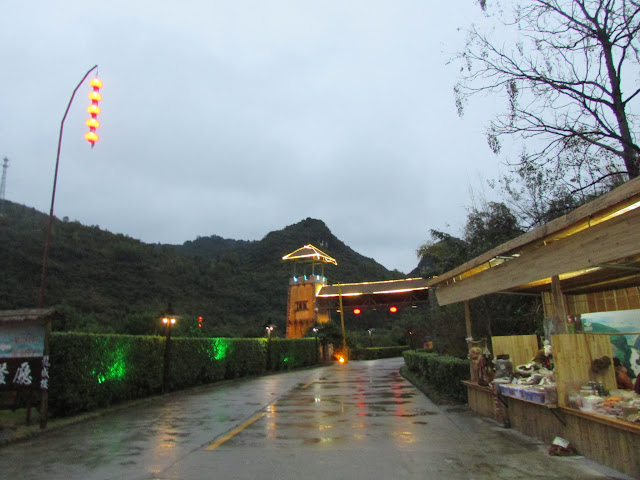 是日行程確是極為鬆動,乘過遊船後離晚飯時間還有近三小時,於是導遊也讓我們決定是否欣賞四點鐘的瑤族表演,表演屬自費,費用為廿元。坳仔前一次才看過,也成少數沒有欣賞的團友。另一車入住景區裡的客棧,所以我們少了「回房休息」這個選項,亦因天氣不好,或要令團友失望了,盤算著如何打發餘下的兩小時。在景區逛遊,更走出景區外的村莊。那裡叫龍潭村,村裡其中一部分已發展成景區(當中包括以前的中學校舍),但位置隔涉下還保留著原始的農村風貌,只是多了幾家村民經營的農家菜館。期間正有農村公交進村載客,有些景區裡的工作人員,下班後乘公交返回市區。村裡亦有舊的糧所、一家小醫院,還有一所廁所,至於廁所裡的環境,當然是意料之內--屬茅廁式設計,進入後十秒內被一股濃烈的臭味包圍,幸好沒見昆蟲飛舞。漫步在農村的田野、河道間,遠方的山頭還有雲海,確實令人心曠神怡。隨著天色開始轉暗,也準備回餐廳晚飯,餐廳裡的菜相當小巧,每道菜都剁得很碎的。