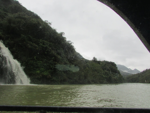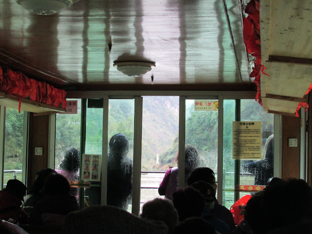 往餐廳午飯期間,途經一家柏木山特產店,讓我們購買土特產,只是沒有心水罷了。午飯地點仍是前一天晚飯的酒家。飯後我們就要翻山越嶺,往湟川三峽景區乘坐遊船,遊船不是露天,故大家不擔心會導致「濕身」,而且有門分隔,在裡面可謂暖和。如果要欣賞到三峽(仙女峽、楞伽峽及羊跳峽,其中羊跳峽是最窄的一峽)最美麗的一面,還要多走幾步,走出船頭細看,不過因天氣問題,只有幾人走到船頭,始終在風雨下感覺更添寒冷。因為前一次一直都在船頭拍攝,所以今回就做「懶人」,大部分時間留在船艙作罷,但時值天雨,還可見明顯的瀑布群,總算不差。