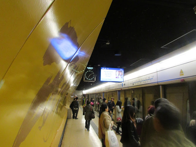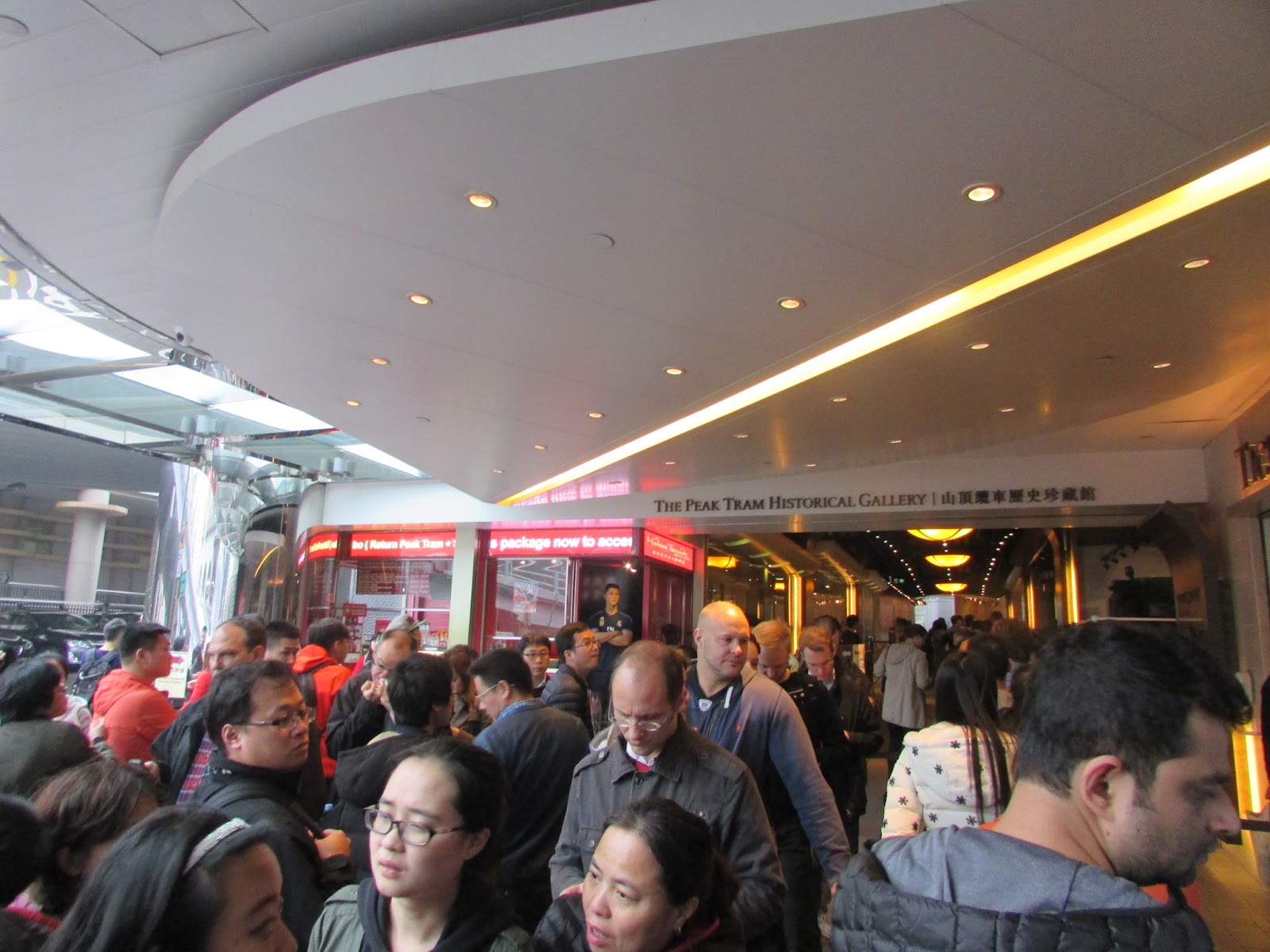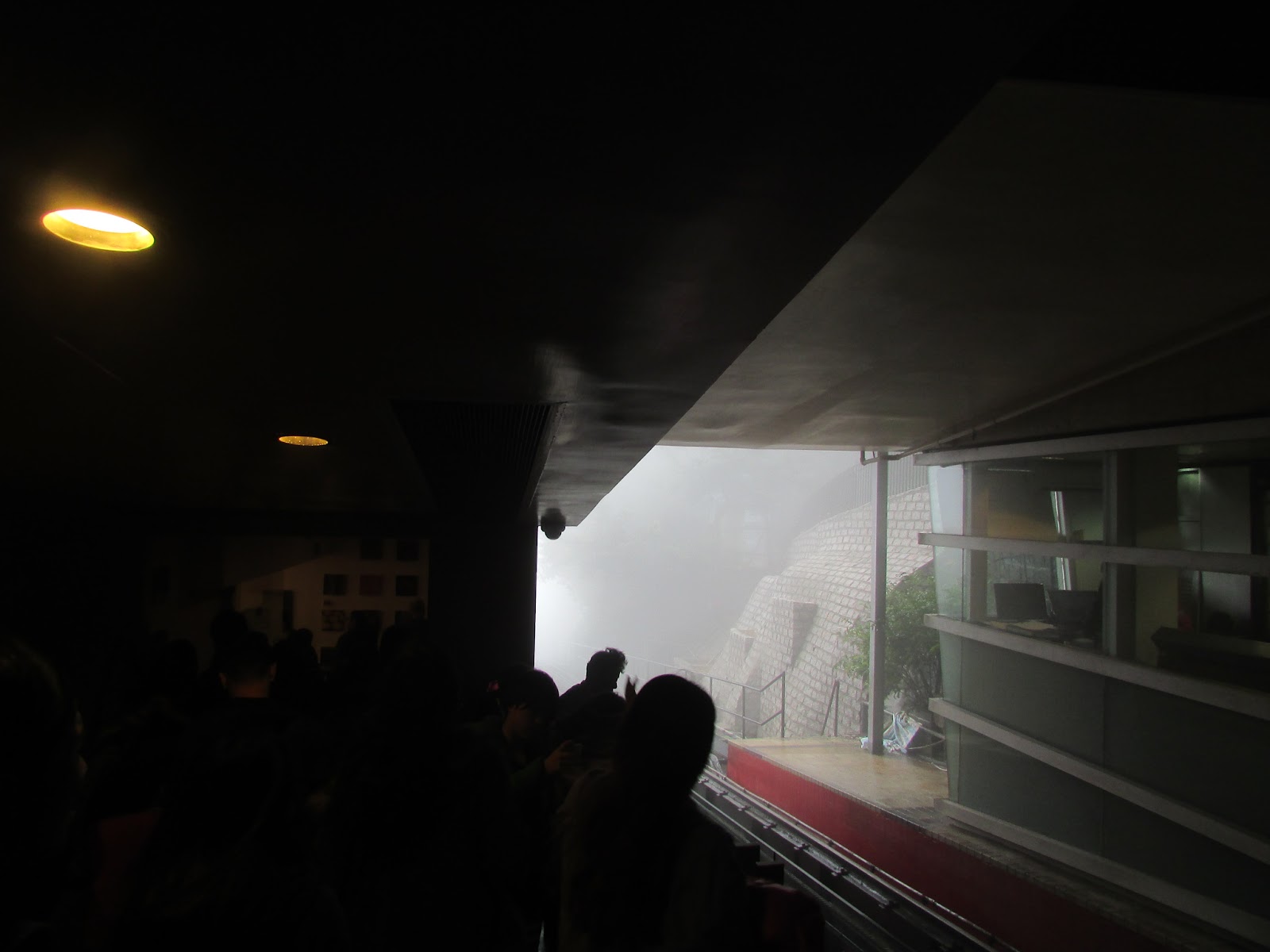 為了體驗乘坐山頂纜車的感覺,一點左右到達中環紅棉道的纜車站,但適逢周六,人流不少,排了半小時才買到車票,單程車票為廿八元,買票入閘後還要多等兩班車(纜車約十分鐘一班)。途中經三座小車站,但因無人要上車,故不會停站,沿途有不少位置相當斜,斜得讓人站不穩,要是下山的話必會更為刺激。如此設計,相信是十九世紀末期其中一項最偉大的建築之一。是日雲層很低,上至半路,已有一種騰雲駕霧的感覺。