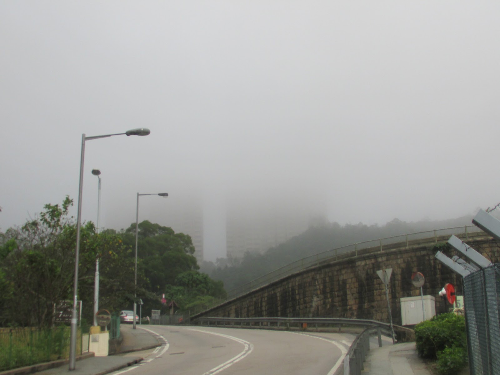 山上總站位處凌霄閣,那裡除了有個商場外,還有個蠟像館及海拔428米的觀景台。由於山頂實在太大霧的關係,所以弄至未出發,就先迷路,在商場內轉了十幾分鐘,還未找到往廣場的出口,終於要向保安人員問路。走到廣場,能見度只有廿米左右,站遠一點拍攝凌霄閣全貌都看不到,然後就要找尋往貝璐道的路,部分位置無行人路,有點驚險。