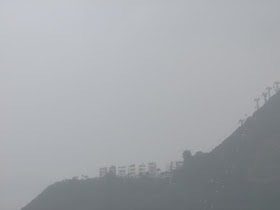 山上總站位處凌霄閣,那裡除了有個商場外,還有個蠟像館及海拔428米的觀景台。由於山頂實在太大霧的關係,所以弄至未出發,就先迷路,在商場內轉了十幾分鐘,還未找到往廣場的出口,終於要向保安人員問路。走到廣場,能見度只有廿米左右,站遠一點拍攝凌霄閣全貌都看不到,然後就要找尋往貝璐道的路,部分位置無行人路,有點驚險。