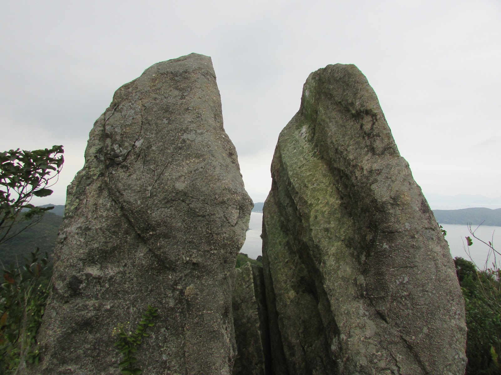 小山崗上有座已失修的觀景台,稍北處正是珓杯石所在之處,珓杯石合共兩座石頭,兩石形狀尖尖且大小相似,石隙的岩面又相當扁平,形似珓杯而得名。離開觀景台時已近四點,接著穿過涌沙頂,然後繞經一處Deep V,直上海拔132米的獅地。