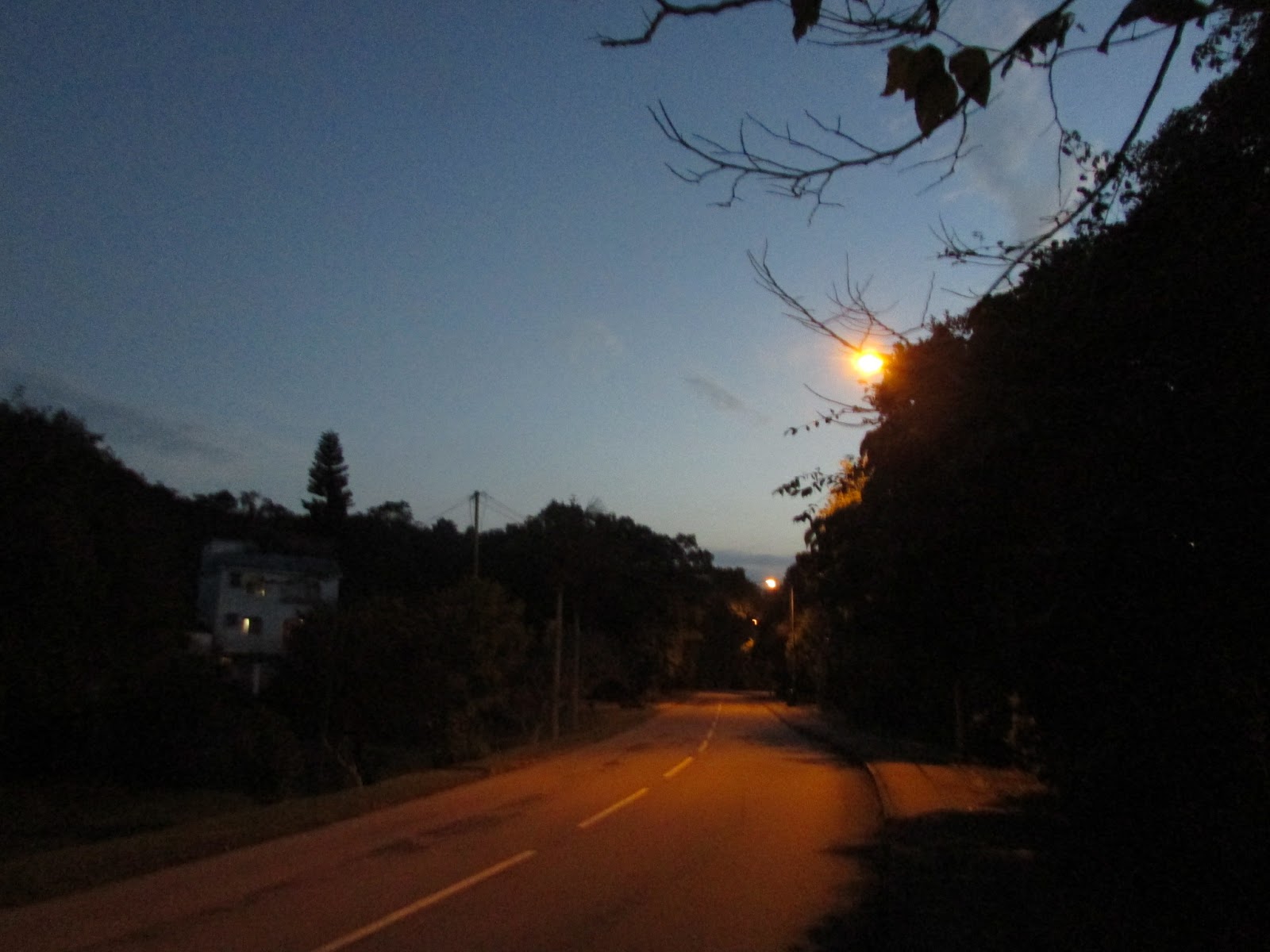 在獅地不作停留,一直依小徑直降大灘郊遊徑,部分位置有點崎嶇。接回郊遊徑時正下著陣雨,隨即就快速的經海邊山徑出大灘村馬路。沿馬路急步上至北潭坳,再直上牛湖墩頂附近,可是路上的小徑還是相當泥濘,更滑倒了一兩次。由於離入黑已不到一小時,所以放棄過大輋嶺墩的計劃,原路下北潭坳,始終在泥濘路下一定不能走得太快,而且山徑亦變得頗滑。再依馬路下北潭涌,順道欣賞久違的晴天日落餘暉。