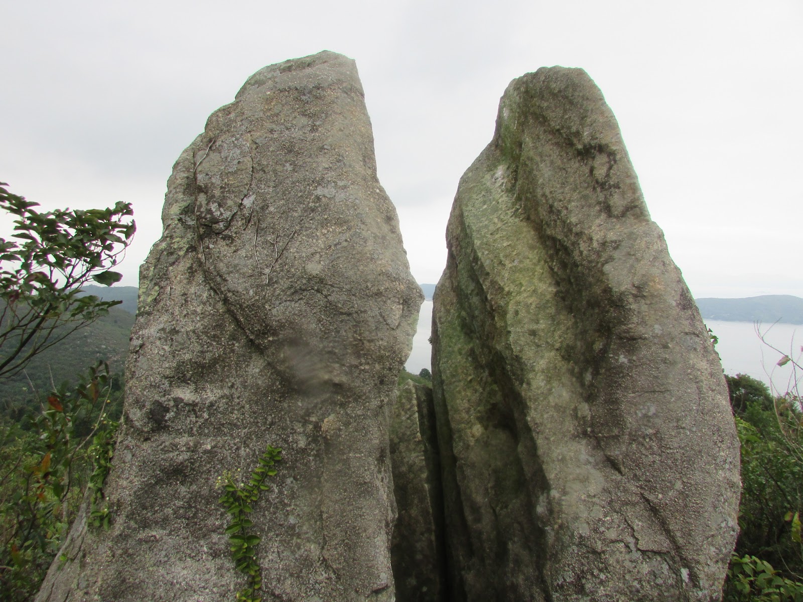 小山崗上有座已失修的觀景台,稍北處正是珓杯石所在之處,珓杯石合共兩座石頭,兩石形狀尖尖且大小相似,石隙的岩面又相當扁平,形似珓杯而得名。離開觀景台時已近四點,接著穿過涌沙頂,然後繞經一處Deep V,直上海拔132米的獅地。