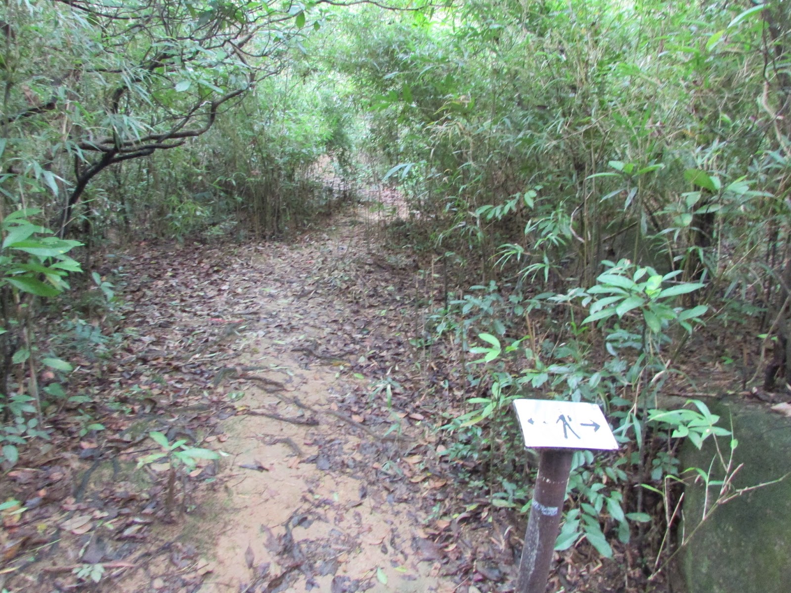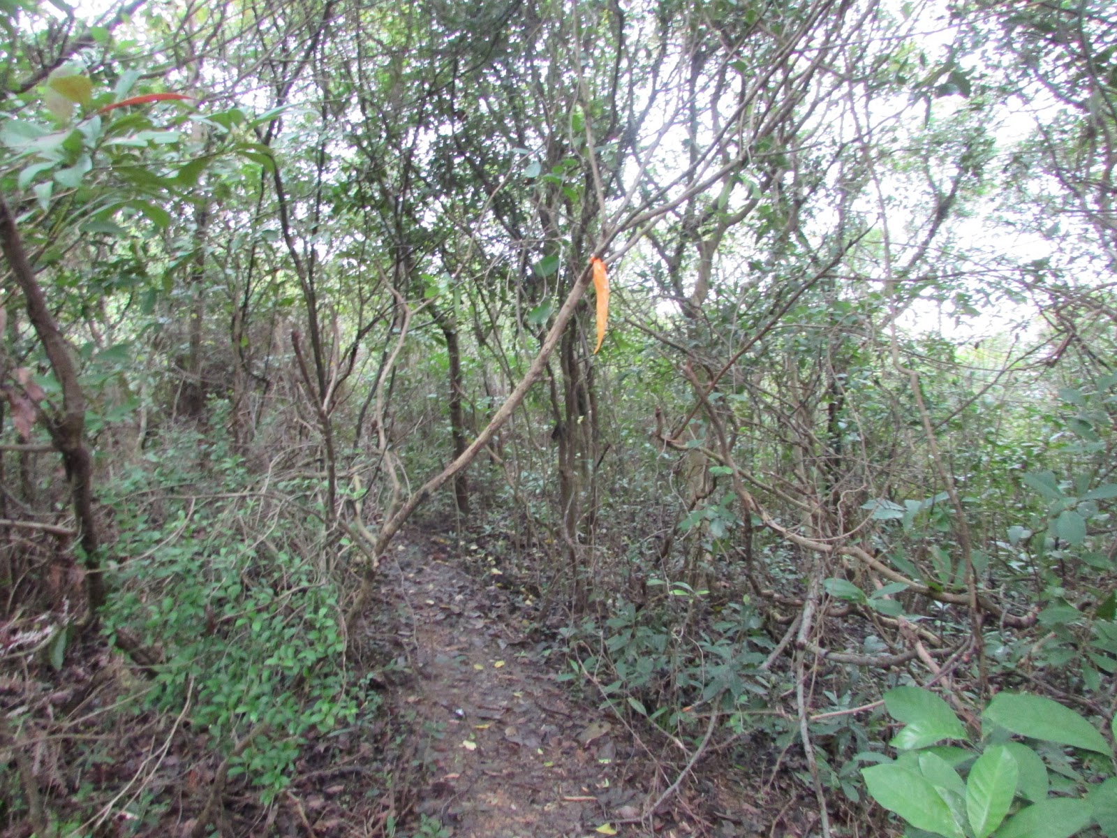 依小徑南下至大灘郊遊徑,但中段偏離了原有路線,引到一支小澗,很快到郊遊徑。向西南方走一段,在告示牌處再繞入小徑,如一直走就到白沙澳下洋,但現在要找的是左上涌沙頂的路。該段山徑似乎很少人走過,野草頗密,只能沿路胚慢慢前行,最後到一處相對寬敞的小徑交點。交點處有幾個路口,在此一直的核對GPS位置與地圖,很快到達涌沙頂西北面的小山崗。沿路有不少野外定向的木柱及一些水泥小徑,可見那裡曾被修理過,包括作為所謂的「均衡定向徑」一部分,只是後來政府不再為此地帶作打理,任由其荒廢,最後就真正回歸大自然。