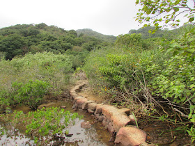 過往兩天潮濕有雨,所以往灣仔半島的山徑上泥濘頗多,半小時後到攔路坳,這裡也是灣仔半島的入口。灣仔,位於港島區的核心商業區,亦是不少大型展覽舉辦的地方,每天日間人們在那裡努力工作,且早晚人去匆匆;至於東北幾十里外的灣仔,則是個完全相反的地方,人們都很休閒的,而且能夠全天候親近大自然。那裡有船直達,加上設施充足,所以是最受歡迎的露營地點之一,若在天朗氣清的周末假期,更有機會人滿為患。