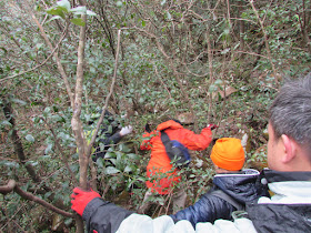 匆匆的朝著礦洞方向下走,途經新桂田右坑中段,澗旁是一段岩石路,由於我們不想體驗免費溜冰服務,所以大家決定在旁邊的樹林繞過,在相約位置才穿過澗道。可見後方的瀑布與旁邊的「黃金洞」洞口,接著經橫山徑過蓮麻坑礦洞六號洞,期間旁邊還有一些小礦洞,我們就在洞內「大廳」大休,部分順便深入礦洞。雖然裡面還是寒冷,但起碼不用「食風」,而步進洞內深入一點點的位置,鏡頭、眼鏡忽然起霧,因為溫度在一步間即上升了十多度,想起很多山洞都是冬暖夏涼的,用作避暑避寒中心倒是不錯的,只是那裡潛在的危險還真不少。