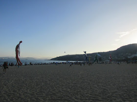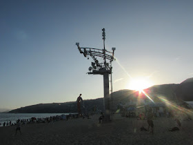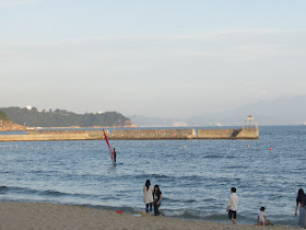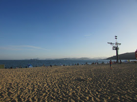 到達大梅沙,要穿過閘口入公園(公園免入場費),灘上遊人還真不少,但人流已少於坳仔預期,有的打著太陽傘、放風箏、架營幕,甚至在玩降落傘、玩風帆,當然少不了小商店,而灘的近盡頭處亦有座燒烤場。是日能見度超過廿公里,連香城的馬鞍山、蚺蛇尖也明顯可見。