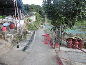 由蛤塘落荔枝窩附近,期間聽到三椏村有村民燃放鞭炮。經山尾坳過三椏,看到幾座神位都在點燈,子孫們則在神位除草、拜祭,而村裡不時傳出鞭炮聲。再經苗三古道返回烏蛟騰,烏蛟騰村屋呈燈火通明的景象,很多在外的村民都紛紛回來過節,而幾家祠堂都大開中門。最後乘坐七點十五分開出的小巴,然後再轉乘地鐵,準時到達位於太子的酒樓,與親戚一起享用豐富的團年飯。等候小巴期間,還以為會「包車」,但在小巴開出前不到十分鐘,就有兩批遠足人士不約而同的到達站頭,算有點意外。