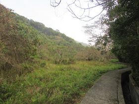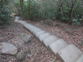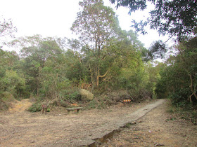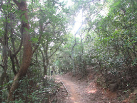 走了約十分鐘山路,可見白富田露營地點,那裡還有一小片疑似廢田。依石磴路上大牛湖頂,途中有很多又大又厚的牛糞,名字果然沒有改錯,不過中間還應該要加上個「屎」字,那麼一定不會較大東北的那座廢村「失色」。全段以樹林地帶為主,只有少量開揚位置下望貝澳及附近海灣的景致,由於是日霧霾較重,所以基本上無甚好看,很快就沿樓梯下抵至芝麻灣郊遊徑附近。