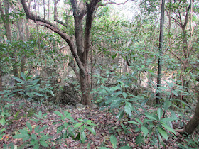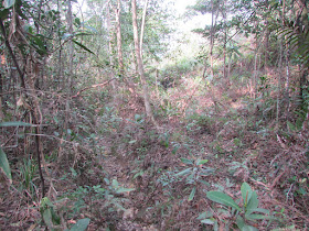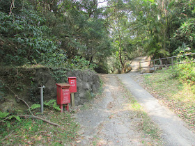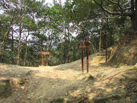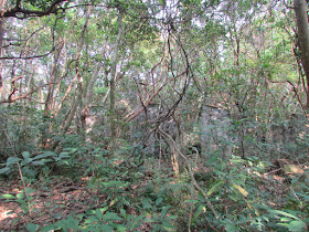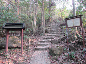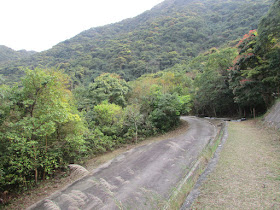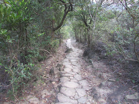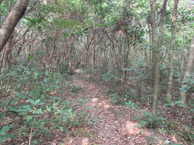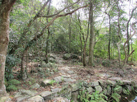 之後就找尋高塘古道落高塘,入口倒是有點隱蔽,較明顯的入口都只抵達電塔或墳墓。反覆找尋了一會,看到入口了,隨著高度的下降,路況引入樹林中,亦有不少人造的建設,如石磴古道或樓梯。半小時後,抵達高塘村後方的馬路,並穿北潭路依村徑往土瓜坪。