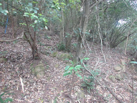 馬尿村是大東北地區以至香城最人跡罕至的廢村之一,那裡不在「迷椏走廊」主路上,位置頗為隱蔽。按照GPS地圖顯示,到達馬尿河邊的小徑,先不沿絲帶群過溪,沿河邊而行,步經一小段石磴古道,之後路況漸趨撲朔迷離,枯樹藤蔓頗多。走了十多分鐘,那裡究竟是廢村所在嗎?對不起,只完成了三分二。看到溪對面的廢田,不過有不少位置被田基隔著,先在某處較好找的位置過溪,穿過凹凸不平的廢田,看到盡頭的堤圍時還要爬上去,終於找尋到昔日屋宅的遺址,村裡只餘其中半邊門框,旁邊則有一些零散碎石,相信以前也是屋宅的一部分。那裡雖然沒有較烏洲塘為遙遠,但找尋難度卻還要高,如無看過政府網上地圖及廢屋經緯度者,根本無法找到,至於近村腹的一段古道,看來也被樹藤掩沒了。