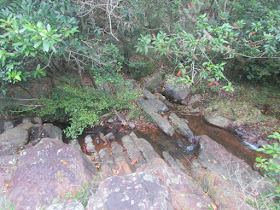 花籃坑一帶的支路有點凌亂(壺穴則在澗道的較下游處,是日沒探),要有良好方向感才不致迷途。朝正南小徑上「跌死狗」(295米),再西走至鹿湖峒,由於山上大霧,故無景可賞,在鹿湖峒先大休半小時。褲管已盡濕,期間已感到明顯寒意,也要急不及待的啟程,途經紅石門坳、觀音峒、大峒、下苗田,最後在六點四十五分回到烏蛟騰。