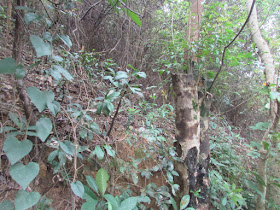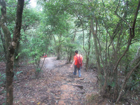 朝南方下榕樹坳,由於太少人走的關係,近榕樹坳一段小徑積了厚厚的枯芒萁,加上近日天氣極潮濕,前一晚也下過場大雨,積水下那段路更是超乎想像的滑腳,根本不能夠站穩而行,途中也滑倒了兩、三次。沒想到只有百餘米的山崗,直線距離只有約三百米,卻要下了半小時。期間要下降一個泥波,雖然有踏腳位及儘量坐著下降,但還是逃不過「瀡滑梯」的命運,把臀部、手掌及相機外殼沾滿泥巴,幸好沒有見紅。再經一片樹林,這時離榕樹坳村水泥徑只是幾米之遙,亦有村民的金塔,不過樹林也相當密,而往金塔的樓梯亦被樹藤掩沒了,只能憑樹剪「爆」至村徑。