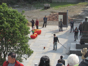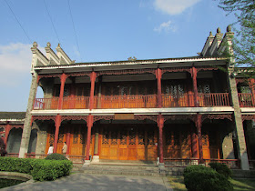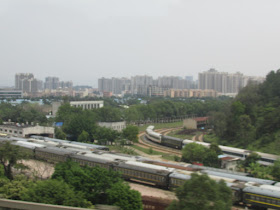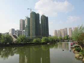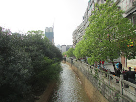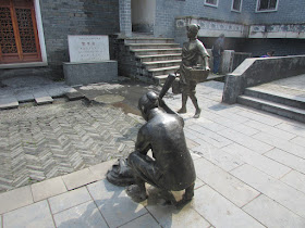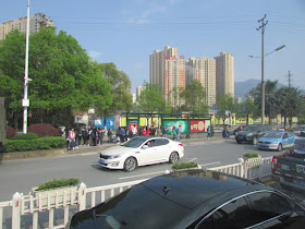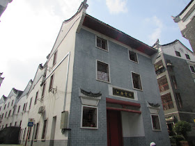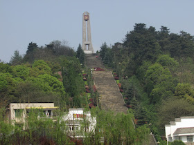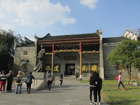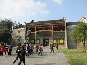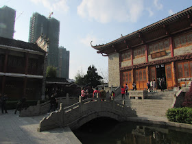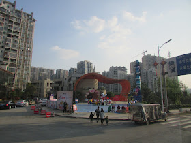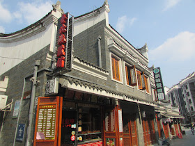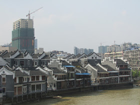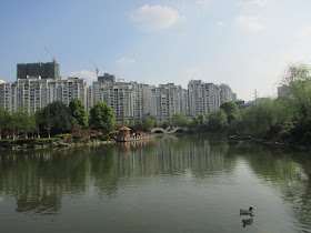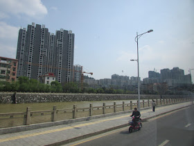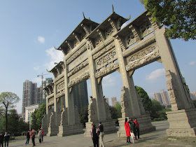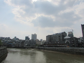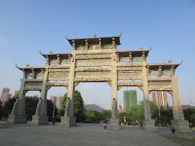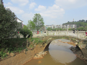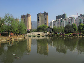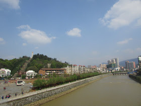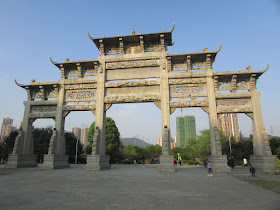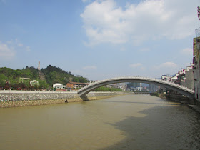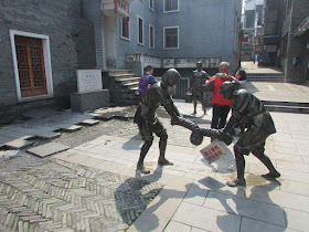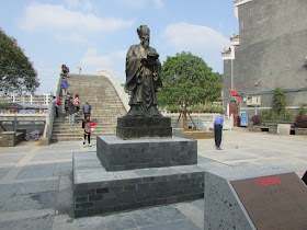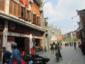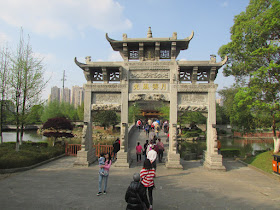 是日遊覽了兩個景點,依次是裕後街及愛蓮湖公園。裕後街是沿郴江河畔而建的古城夜市,可能是時間還早的關係,不少店鋪還未開門。不過,古城感覺上有點「變質」,一來建築物看來太現代化了,二來商業味也似乎太重,有的店鋪採用了外地地名,例如「士林」、「日月潭」、「圓山」等等,與湖南省或郴州市根本沒甚關係,坳仔在想,究竟正身處湖南還是台灣呢?究竟那些店鋪由誰人開呢?不過,街上倒是有些富當地特色的銅像,例如「米碼頭」、「犀牛井」、「騾馬古道」等,解說昔日農耕時代的概況。另外,亦有人在圓拱橋前的小空地,持續用鞭子把大陀螺,打至發出「達達」聲。
