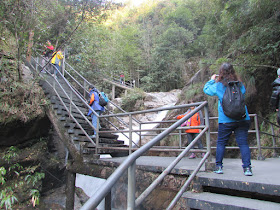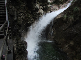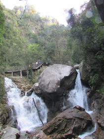 參觀博物館後就欣賞猴王寨景區的瀑布群,包括「翡翠潭」、「天潭」、「孔雀瀑布」和「九疊泉」等,景區棧道用木製成,終點在「九疊泉」,總爬升高度約二百米。慢慢走,來回步程約需一小時,由於近一星期那裡下過多場大雨,使瀑布變得相當澎湃壯觀,水花更飛濺到棧道上。