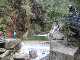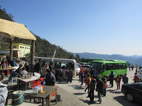 近一時換乘小環保車上天台山景區,車程達半小時,而後半段更是彎多路窄且地勢險要,司機要多次鳴笛,而且景區也不限制自駕遊的遊客,沿途不時有小轎車迎面而至,可謂驚險,在某處急彎更因兩車間難以讓位,司機繼而引起一陣爭執。