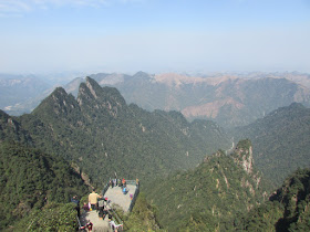 穿過「天台殿」,再前走十分鐘左右就到「小天台」觀景台,而落觀景台的盡頭是道相當陡斜的樓梯,但也吸引不少團友留影,因為那裡可更清楚看到前面一眾險崖的風光。至於上「大天台」則要再多上約一百米的樓梯,不過景觀略遜於「小天台」,對面的山頂有座亭狀的發射塔,順道一上,兩者中間則隔著個「東天門」大峽谷。團隊在三點半在景區停車場集合,而到「大天台」時只餘下廿分鐘,匆匆拍攝過後就立即原路衝下山,最後連「金鞭神柱」也沒看,而附近也有道修建中的滑梯,直降停車場。