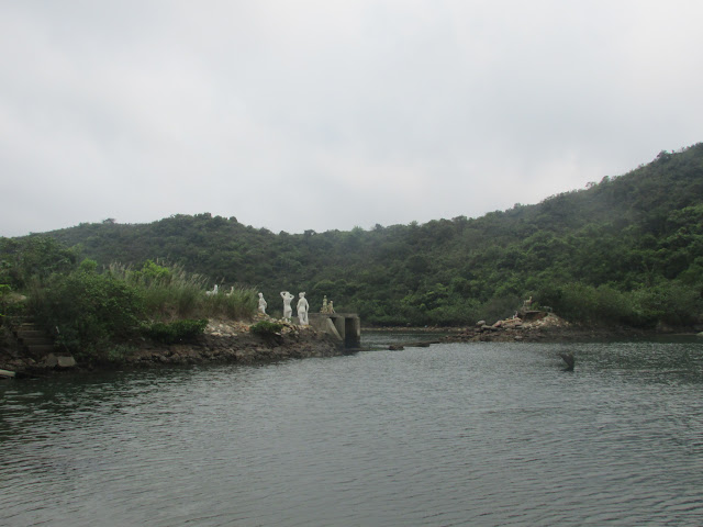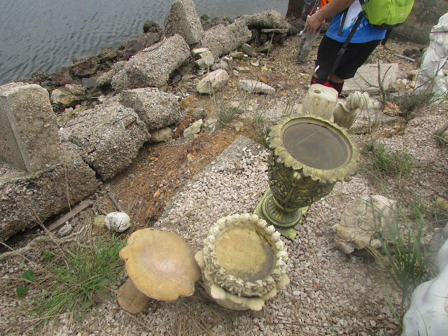 走了約十分鐘後上岸,又經破堤壩附近,發現壩上又多了一些雕像,像是身處在希臘神話的故事中,至於它們從何處來就真的不得而知了。大家拍攝過後,在旁邊滿佈雜草及枯樹的水泥路前行,部分位置更斷開,要綑邊而行,途中也有一些雕像。十五分鐘後到養珠場遺址,有兩排大廢屋及小碼頭,不遠處有幾片隔板,相信是養珍珠的池子,而另一邊也有一些塌下的鐵皮屋及養珠場工人用過的物件。我們之後要找路上環湖徑,入口並不明顯,上山時部分位置極斜而且要「爆林」。