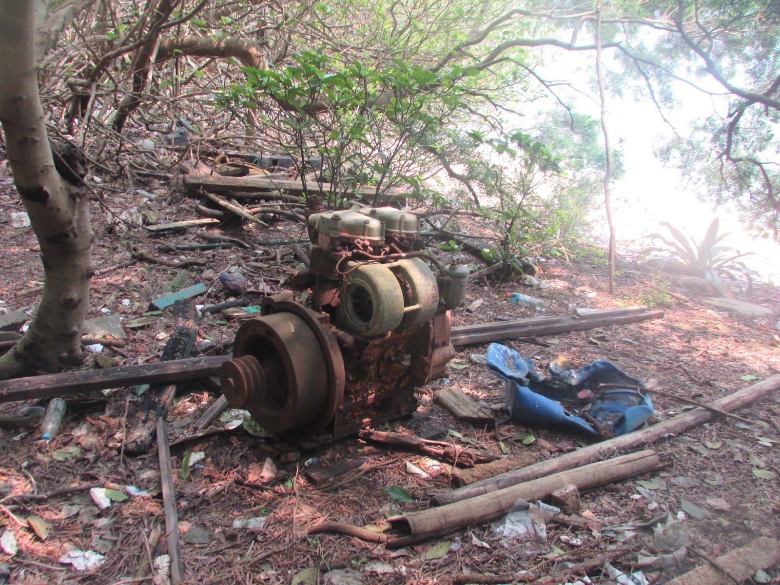 原路上走至較開揚處,穿過廢村出紅石門,在近紅石門的一個明顯路口試沿另一道小徑直落內灣,岸邊停著一台貨車(當然已荒廢),雖然可見海邊,不過前路已被重重樹藤包圍著,而另一邊出海邊的小徑亦被水淹,結果又要返回山崗路口再落紅石門。