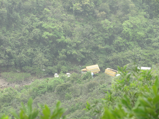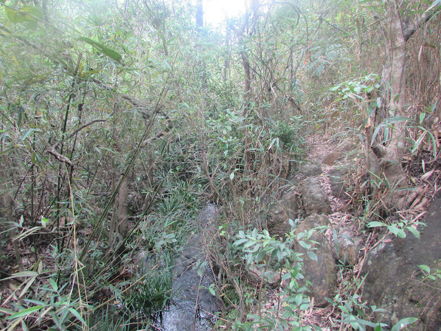 在小滘坳(鵝髻頂附近轉往黃竹角咀的路口)轉偏東南面的隱蔽路口緩步而下,引路帶頗為稀疏,約一段距離後才接上鳳凰溪澗道,澗道上游暫時無水,但石面則較濕滑,所以有的隊員不斷的「爆林」下行。近半小時,其中一位團員開始感到不適,因為我們只走了全澗道的五分一,被迫放棄繼續下行。