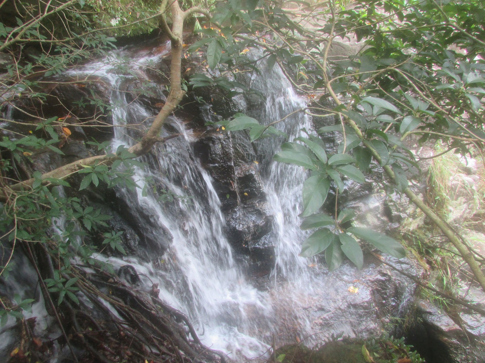 在「跌死狗」下平地大休半小時,這裡吹著涼風,而且風力也有點大,感覺很舒服,讓人不想再起步。下降一段急斜過溪,再往左行落烏洲塘,林裡濕度很高,亦有一些蜘蛛網,令眼鏡沾上不少汗水及蜘蛛絲,更差點看不到路況,原來鏡上已有很多刮痕,把光線折射得很厲害,看來眼鏡快將壽終正寢了。幾天前下過場大雨,使花籃坑澗道的水量相當豐盛,要小心的下溯,謹防石面滑腳,十分鐘左右到傳說中的壺穴。近壺穴的樹根踏腳位被水掩,故是日難以看清壺穴的面貌。