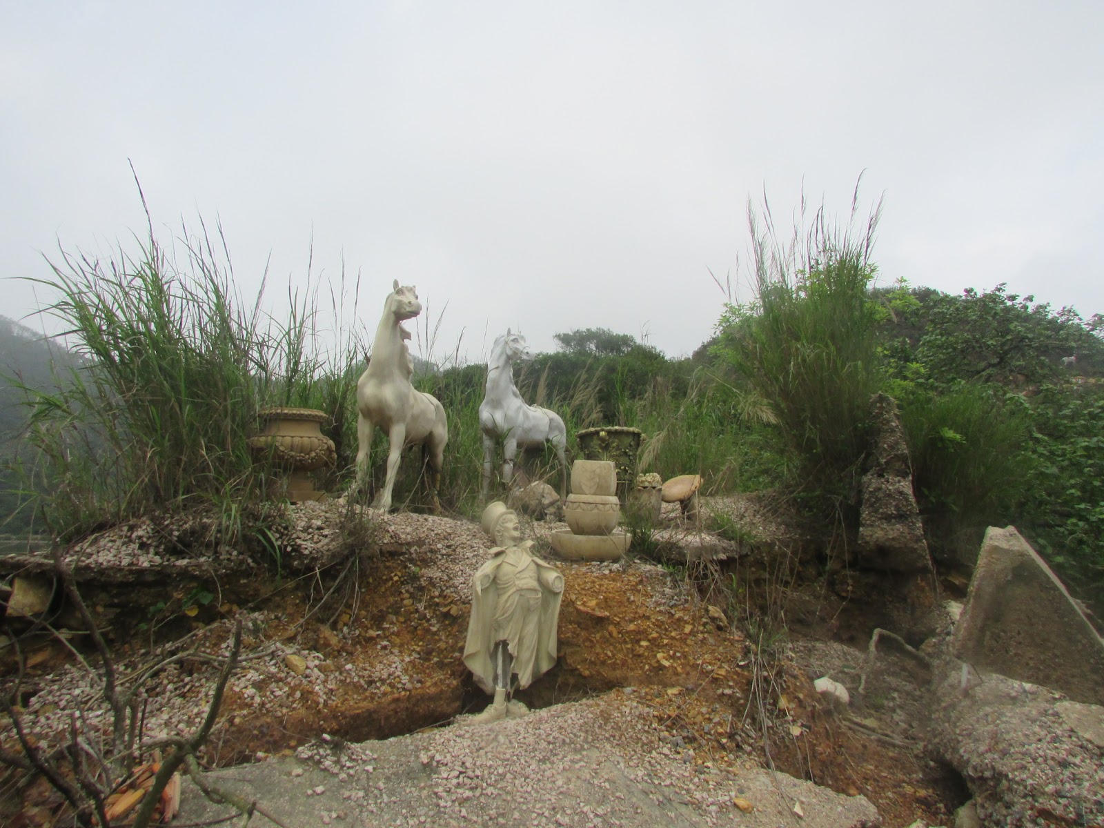 走了約十分鐘後上岸,又經破堤壩附近,發現壩上又多了一些雕像,像是身處在希臘神話的故事中,至於它們從何處來就真的不得而知了。大家拍攝過後,在旁邊滿佈雜草及枯樹的水泥路前行,部分位置更斷開,要綑邊而行,途中也有一些雕像。十五分鐘後到養珠場遺址,有兩排大廢屋及小碼頭,不遠處有幾片隔板,相信是養珍珠的池子,而另一邊也有一些塌下的鐵皮屋及養珠場工人用過的物件。我們之後要找路上環湖徑,入口並不明顯,上山時部分位置極斜而且要「爆林」。