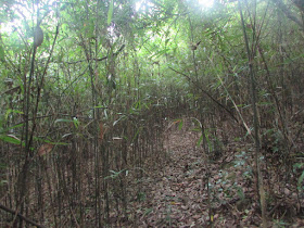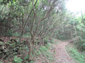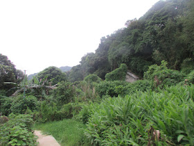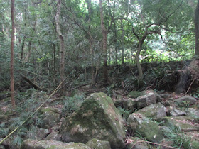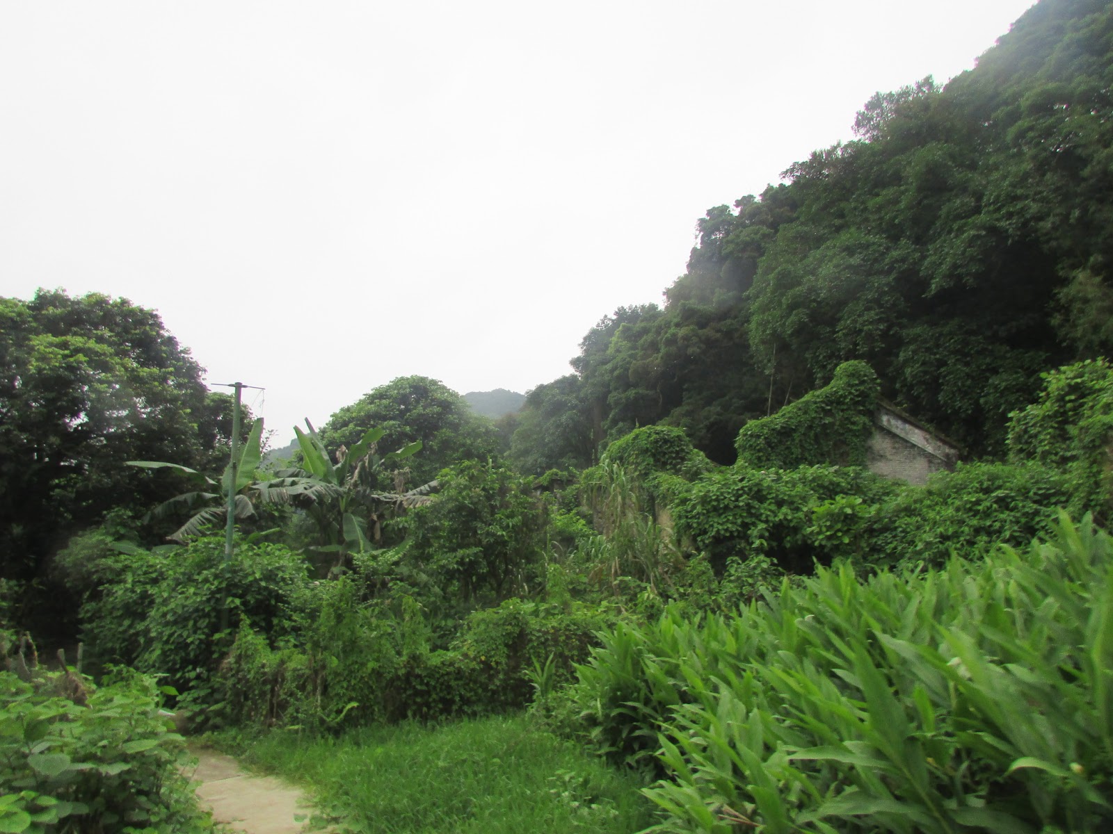 靠近稔坳時路況變得更為撲朔迷離,也要穿過一片廢田(有的位置較深,要小心穿越),亦有不時有樹藤或枯枝攔阻,半小時後可見稔坳村的廢屋殘垣。往長瀝尾的山腰徑也是如此,不斷的留意引路帶位置及GPS地圖,慢慢的穿林越棘,至於部分位置是竹林地帶,算是好走一些。當時只是四點左右,不過天色越來越陰暗,林裡光線不足,連引路帶有些難找,很多地方是似路非路,極易令人迷途,所以稔坳、長瀝尾一帶在天陰日子其實是不宜探遊的。走著走著,已見長瀝尾的廢田基,再穿一段密林就上狗肚山坳,景觀明顯開朗——雖然長瀝尾村的廢屋最後還沒找到。