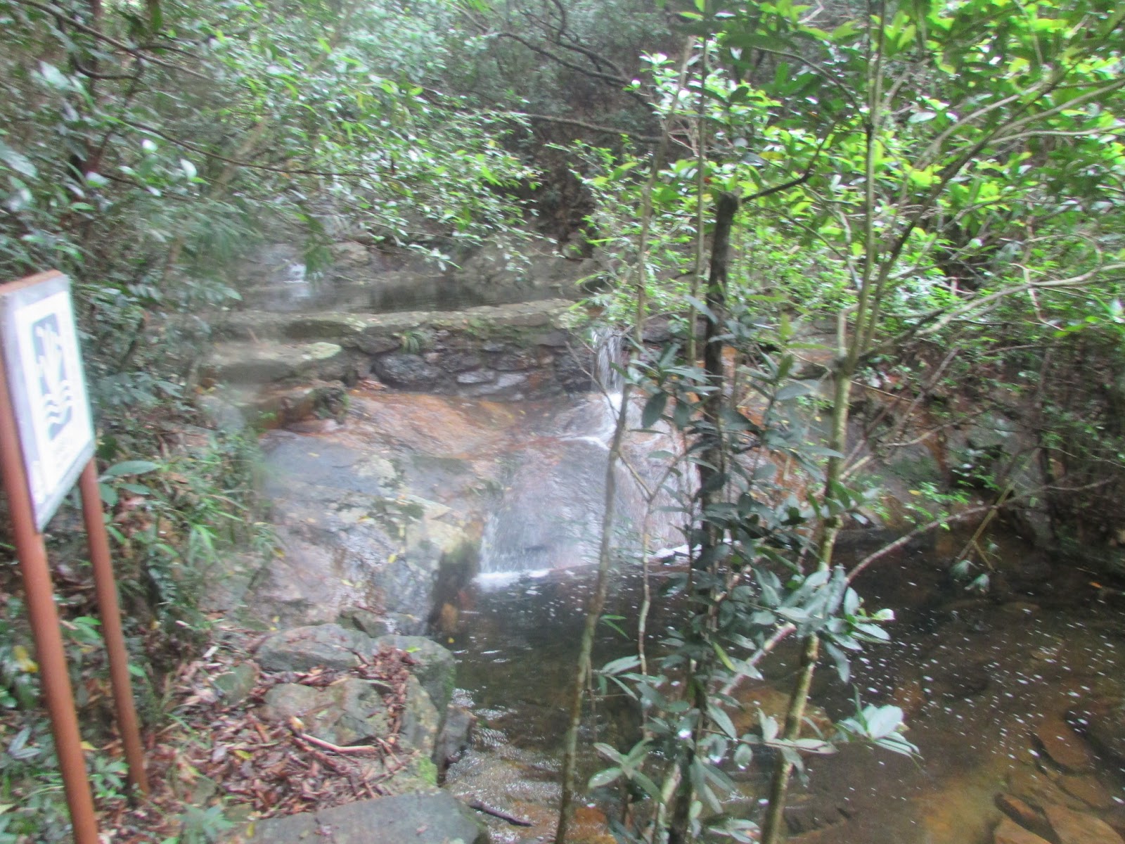 由大尾篤巴士站起步,在龍尾村依捷徑上引水道,可惜未能找獲上山入口,要沿馬路上行繞經遊客中心。左轉幾分鐘,穿過引水道小橋上山。初段是樹林,由於早上下過雨,所以植物也頗多積水。上了半小時,發現有點「不對路」,原來GPS地圖顯示正往馬騮崖方向上山,但明明沿途無其他支路,回走一段也不見明顯小路,相信是走錯入口了。爬崖並非行程的一部分,所以折返八仙嶺自然教育徑,再在仙姑峰東麓的山腰中慢慢上走,最高點海拔達360米,也是難度最高的自然教育徑。