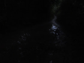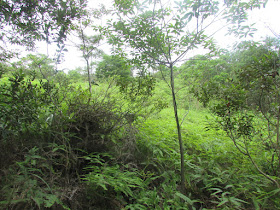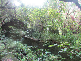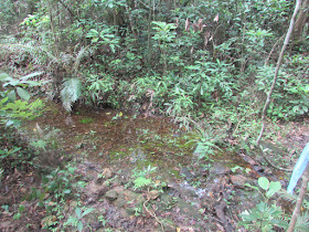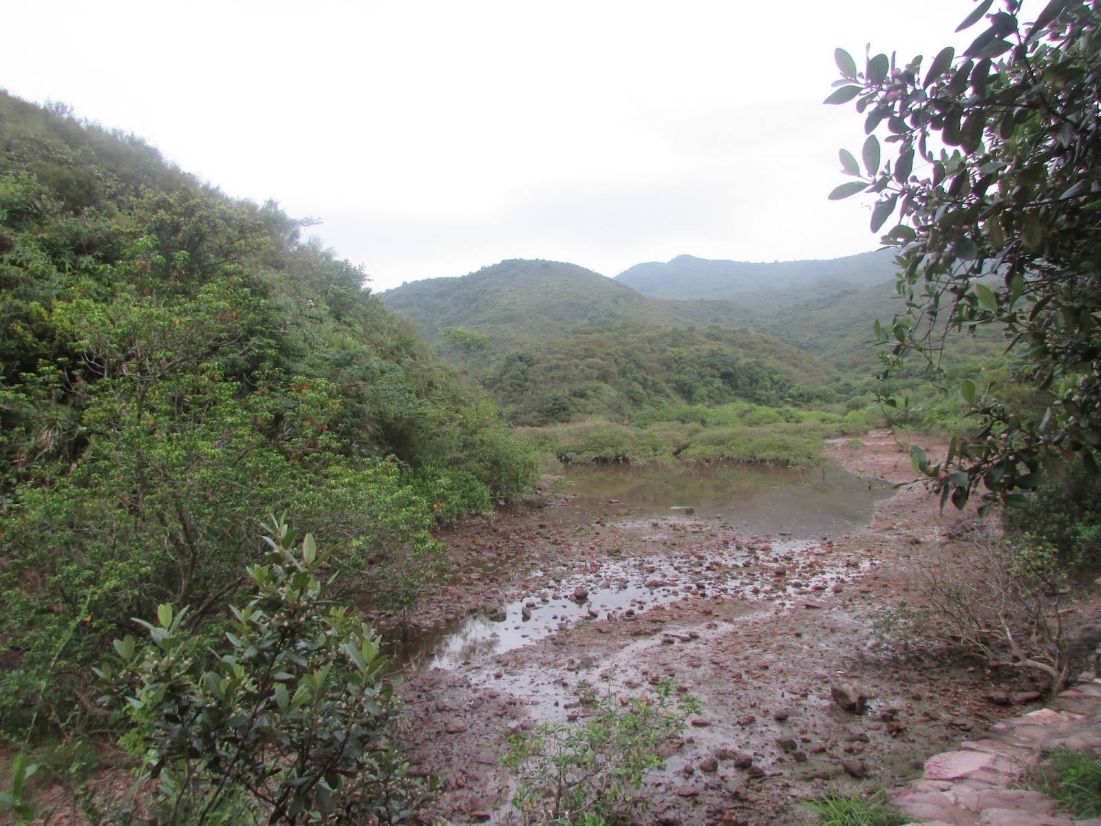 在路口左轉往橫山腳下村,野豬群把近村口位置蹂躝得一片狼籍,附近的大片山坡植物也被弄至難而生長,之前也在那裡遇過兩次野豬。剛才有一隊遊人從那裡而來,加上時候尚早(只是三點鐘),當然野豬就不出來活動。破屋群深藏在樹林中,而且野豬常常出沒,那裡似乎較傳說中的鎖羅盆、牛屎湖村還要恐怖。接古道經「關爺坳」過橫山腳上村,同樣已荒廢,山徑旁邊和堤圍下都各有一排破屋。再穿越「橫山腳南橋」,在交界處下走廢田區落新娘潭。