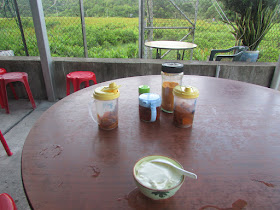 在大石盤探過神秘的小村後,接回古道急走至荔枝窩小休,循例看看近來復耕的農田。到達荔枝窩時已是五點半,所以村前廣場並無其他遊人。經小灘過三椏村,是日是星期六,黃昏三椏村士多不會關門,在此惠顧一客豆腐花後,沿苗三古道回烏蛟騰。想不到苗三古道的大路中也碰上不少蜘蛛網,而且在九擔租附近更遇上兩大片泥沼,無一處是好走的,無論走「上路」還是「下路」往來三椏都是避不了的,看來雨天過後不宜立即走東北區了。
