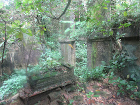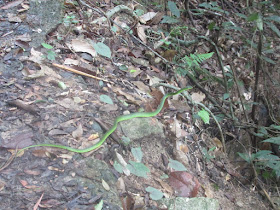 經古道迴上烏蛟騰,途中巧遇一尾翠青蛇擱在路旁,幾乎動也不動。過了田心村(即媽騰古道、烏蛟騰郊遊徑入口)左方另有一道小徑,就是媽騰古道的舊路了。朝著某遠足隊的引路帶上山,部分位置叢林很密,甚至有帶尖刺的樹枝、樹幹,而在這個時節穿林碰上蜘蛛網也是在所難免的事。臨到郊遊徑(古道的新路),看到少量民居遺蹟,林裡深處還有座完整的廢屋,而且裡面擺設亦算整齊,感覺真的有點詭異,門框上寫著「大石盤」(只是由遊人寫下),可能是附近村民所命名的「土名」。查閱民政事務總處的鄉村範圍圖,那裡不在亞媽笏範圍內,地圖又沒有「大石盤」的名字,鄉村名冊中又無其名,究竟那座小村本身的名字叫甚麼?