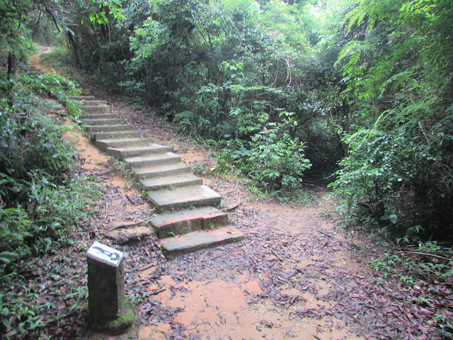 三點半在華景山莊起步,上山初段是類似晨運徑的樓梯。雨後陽光初現,地上的水份伴隨熱氣蒸發掉,有點悶熱難當。再走上一段碎石稍多的山徑,抵達金山發射站稍休,然後依著明顯山路落金山路。那段落山山徑是朝著東南而下,途經疑似晨運客自行建成的「石仙谷」,有一些椅子在,但近來似乎無人打理過,長了不少雜草。穿過一道又一道的溪澗,很快到金山路。