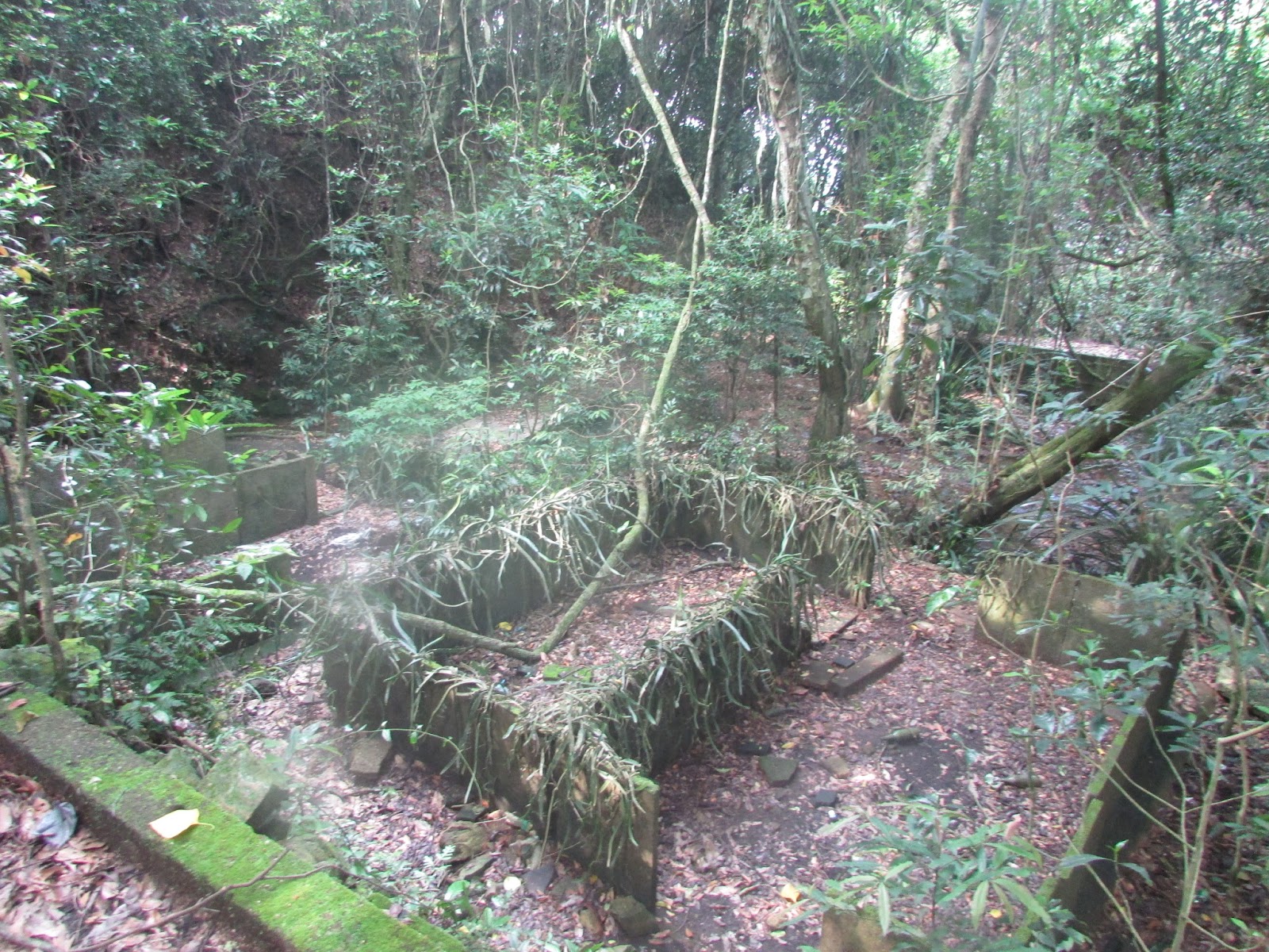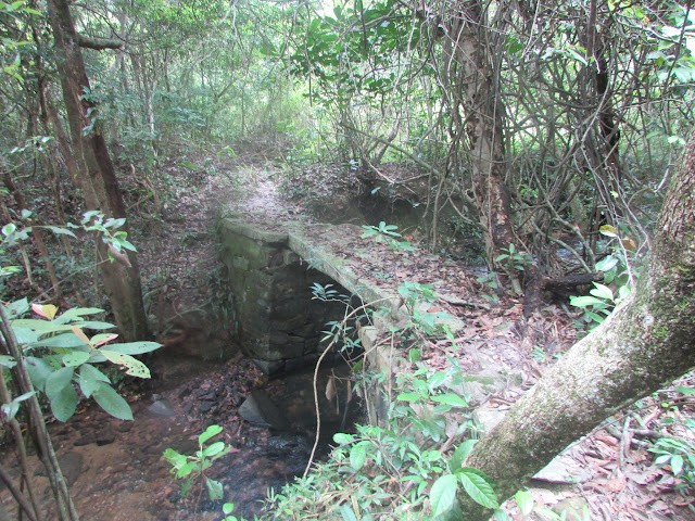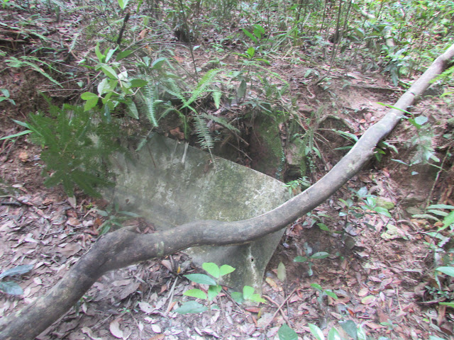 經過新娘潭橋,右邊為新娘潭自然教育徑,但沿左走則接貫穿三擔籮的隱蔽古道,途中廢田、積水處處,而原有的古村遺址也已幾近全數湮沒,在林中轉了廿分鐘,才到烏蛟騰抗日烈士碑。那段古道雖然離新娘潭路只有一百米距離,不過有的位置倒是撲朔迷離,只聞車聲,不見馬路,不識途者還是很易迷路的,想起了幾年前有遠足人士在大尾篤一處密林中暑繼而失救,大路卻只在廿米外,所以別小看密林、樹林的「威力」,人類其實是很渺小的。