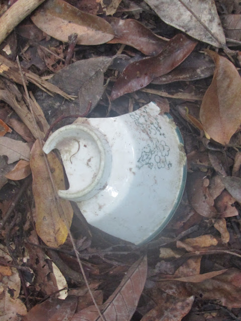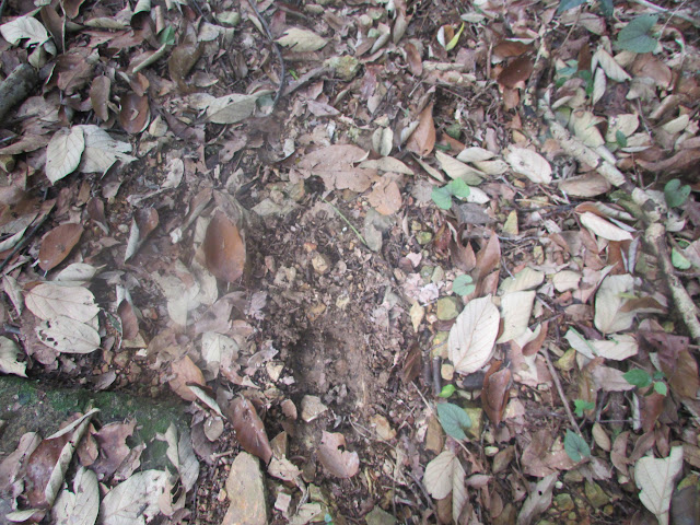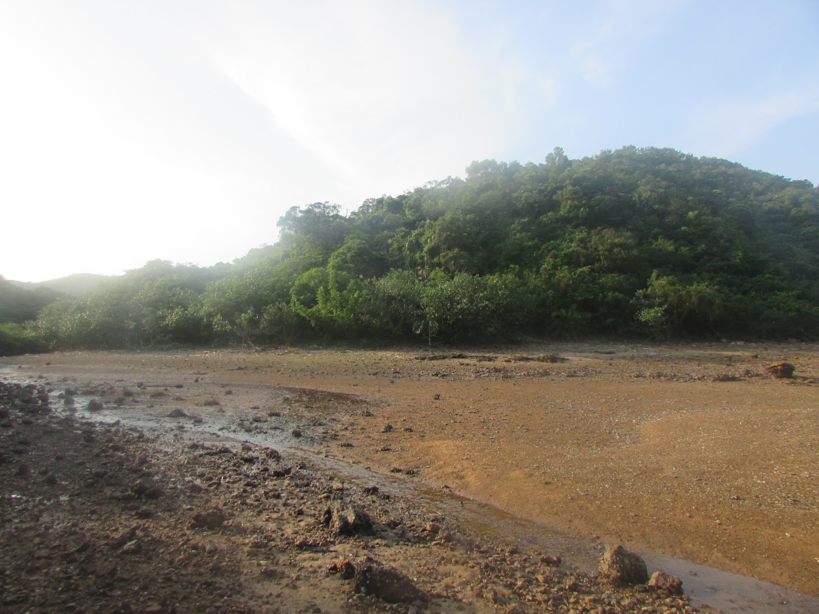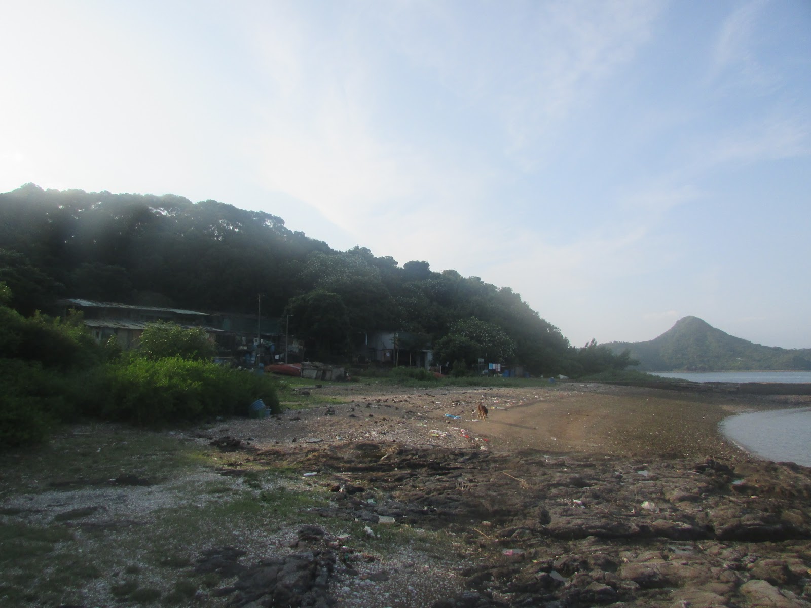 補給後經公廁旁小徑過牛屎湖村,正值春夏交替時期,加上那道小徑是「上網熱點」,先拾起樹枝作「上網先鋒」,不過途中蜘蛛網數量出奇地不多,或許剛才有遊人走過,趁退潮經廢村再綑邊吧。不消半小時到牛屎湖廢村,那是傳說中的「一夜棄村」的地方,不過從附近村民口中得知事實應非如此。前兩天下過大雨,村中小溪有明顯流水,更發現很多蟹類在廢村周圍活動。經廢村堤壩落海邊,路邊的濕土有一些野豬蹄印,由村腹、村徑路邊、至近海邊處都有,蹄印也有點深,如果有人上落時,忽然有頭大野豬在旁走過,肯定會被嚇怕了,不過大白天時幾乎沒可能遇上此畫面。