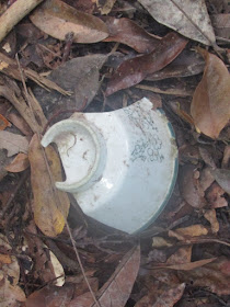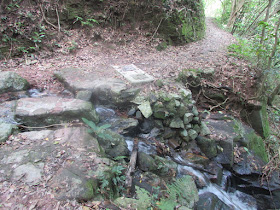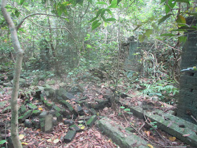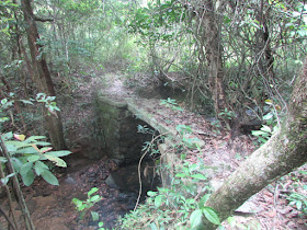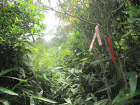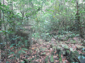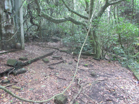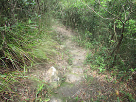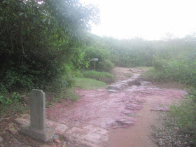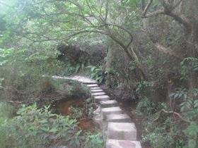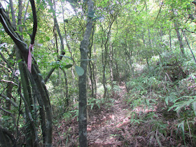 經過新娘潭橋,右邊為新娘潭自然教育徑,但沿左走則接貫穿三擔籮的隱蔽古道,途中廢田、積水處處,而原有的古村遺址也已幾近全數湮沒,在林中轉了廿分鐘,才到烏蛟騰抗日烈士碑。那段古道雖然離新娘潭路只有一百米距離,不過有的位置倒是撲朔迷離,只聞車聲,不見馬路,不識途者還是很易迷路的,想起了幾年前有遠足人士在大尾篤一處密林中暑繼而失救,大路卻只在廿米外,所以別小看密林、樹林的「威力」,人類其實是很渺小的。