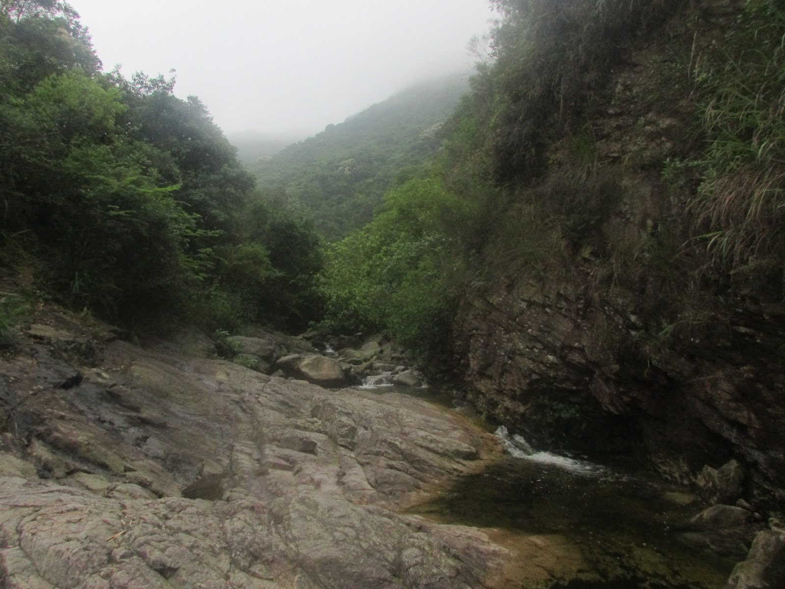 覓路經新屋仔上南涌郊遊徑,幾乎是無休止的上山路,直至平頂坳附近為止,途中經過一座天然的觀景台(但離主徑約一分鐘步程),可望上水、粉嶺群村風光,但目前正身處薄霧中,能見度難免較差。平頂坳不是全段南涌郊遊徑的最高點,要再上一段路後才急降至老龍田,近山頂的路較為濕滑,應加倍小心。老龍田位於屏南石澗中段,在上世界三十年代港九大隊游擊隊在那裡建了個政訓室,不過二戰時被日軍搜捕,有些隊員在此犧牲,至於政訓室的遺址或許已被叢林覆蓋了,只餘一兩片疑似田野殘垣。沿著澗旁聽著澎湃的水聲下行,十餘分鐘後再過一道小橋,旁邊的大水潭旁還有疑似廢屋遺址,但那裡已與老龍田有一段距離了。再依古道緩步下走,很快到達南涌盡頭的馬路,由於當時正是回程高峰,單是鹿頸也上滿了遊人,所以不在南涌候車,直接再步行約十五分鐘,出沙頭角公路巴士站作結。