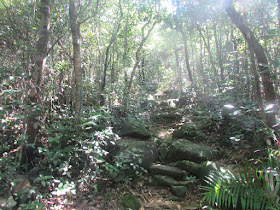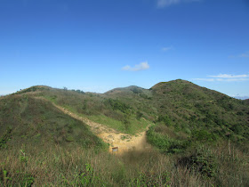 轉入麥徑後就要不盡的直上三百餘米至馬鞍坳(麥徑往馬鞍山頂的路口),天氣炎熱,步速不能太快,一共用了四十五分鐘才到馬鞍坳。天氣很熱,想著下一站要往馬鞍山還是大金鐘,如果走大金鐘的話會輕鬆一點,但如此高能見度的假日實是非常難得,所以寧可辛苦一點,取馬鞍頂,捨大金鐘,起碼在新界不少地方都可以看到馬鞍山的蹤跡。上山途中旁邊不時有險崖峭壁,不少經典險線都在那裡匯集,例如「彌天棧道」、「東馬肚」等,至於是日所走的已是最易走的一條了,不過部分位置斜度還是有點高。