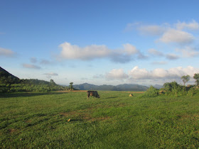 斜陽映照下的草原,更顯翠綠,隨處可見牛群在吃草: