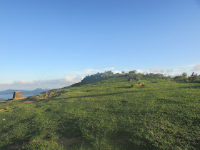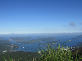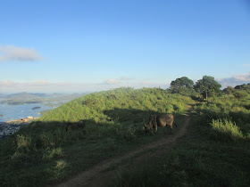 用了廿多分鐘上達馬鞍頂,亦稱之「馬頭峰」(不是吐露港對岸、船灣淡水湖後面的那座山),可賞範圍包括沙田區、大埔區、船灣淡水湖及郊野公園、西沙路群村、企嶺下海潮退下露出的泥灘、西貢市中心、清水灣半島、將軍澳、九龍市區及深圳鹽田、大梅沙等。賞景及休息廿分鐘,原路返回麥徑,再急速往昂平觀景台。斜陽照射下的草原,顯得更為翠綠,牛群在悠閒的吃草,有如身處外國。最後就續沿麥徑四段,在五聯達學校遺址轉落茅坪新屋廢村,再經梅子林返回大水坑作結。是日原本還要探遊黃竹山村,希望可以連走帶「黃竹」的兩座廢村,只是時間不足,而且近入黑林裡的野生動物可能已非常活躍,所以最後也沒探。