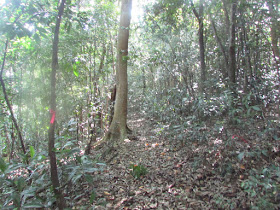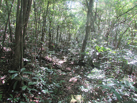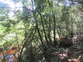 由企嶺下老圍起步,在村口對面上樓梯,再採古道捷徑直往黃竹洋。盛夏時節,不時有大木林蜘蛛在林中出現,牠們結網的面積相當大,不過蜘蛛網數量就較四、五月時的少,也較容易發現,相對來說是略易避開的。古道沿途不時佈滿竹林,竹樹很密,在盛夏午後仍覺陰暗,走著走著,錯走了往較南端上觀景台的路了,於是接回原有古道,續往黃竹洋。在古道行走期間,遇到有尾眼鏡蛇橫過山徑,而且長度達兩米左右,還未及得拍攝,就已鑽進草叢了。