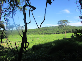 走了不到廿分鐘,到達黃竹洋的廢田區,只見已被破壞的田野,在夏天又長出一片綠草,在陽光照射下特別可愛。穿過小橋往村腹,可是田中的水泥徑被野草蓋得連路胚也完全看不到,所以再試由橋邊的小徑繞過,到一道小溪時發現路又斷了,看到較遠處有一兩座廢屋,於是用自己的方式穿越野草林。穿過草林期間真怕踩中潛藏的蛇,一來時值夏天,蛇類活躍,二來剛才遇到眼鏡蛇,但真是沒辦子,五分鐘後到達村腹的廢屋群。